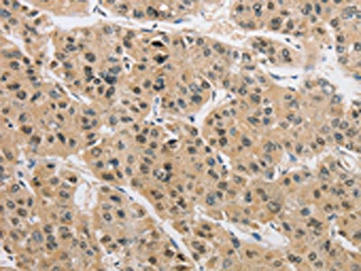 The image on the left is immunohistochemistry of paraffin-embedded Human liver cancer tissue using CSB-PA063322(AMZ2 Antibody) at dilution 1/40, on the right is treated with fusion protein. (Original magnification: ×200)
