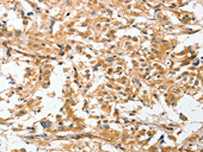 The image on the left is immunohistochemistry of paraffin-embedded Human thyroid cancer tissue using CSB-PA580017(ANGPTL7 Antibody) at dilution 1/30, on the right is treated with fusion protein. (Original magnification: ×200)