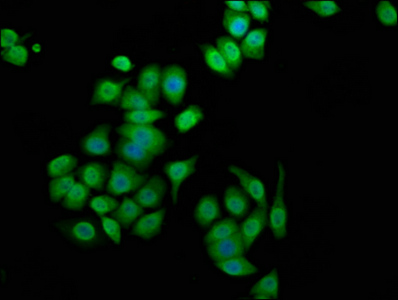 Immunofluorescence staining of PC-3 cells with CSB-PA619642LA01HU at 1:100, counter-stained with DAPI. The cells were fixed in 4% formaldehyde, permeabilized using 0.2% Triton X-100 and blocked in 10% normal Goat Serum. The cells were then incubated with the antibody overnight at 4°C. The secondary antibody was Alexa Fluor 488-congugated AffiniPure Goat Anti-Rabbit IgG(H+L).