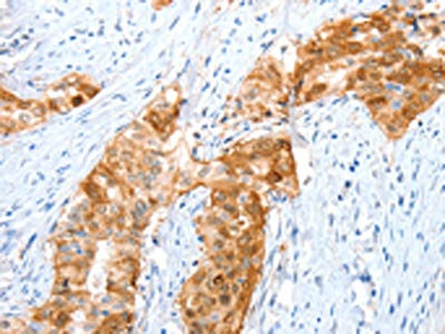 The image on the left is immunohistochemistry of paraffin-embedded Human esophagus cancer tissue using CSB-PA441788(ANXA8 Antibody) at dilution 1/35, on the right is treated with fusion protein. (Original magnification: ×200)