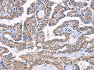 The image on the left is immunohistochemistry of paraffin-embedded Human thyroid cancer tissue using CSB-PA062845(AP1B1 Antibody) at dilution 1/70, on the right is treated with synthetic peptide. (Original magnification: ×200)