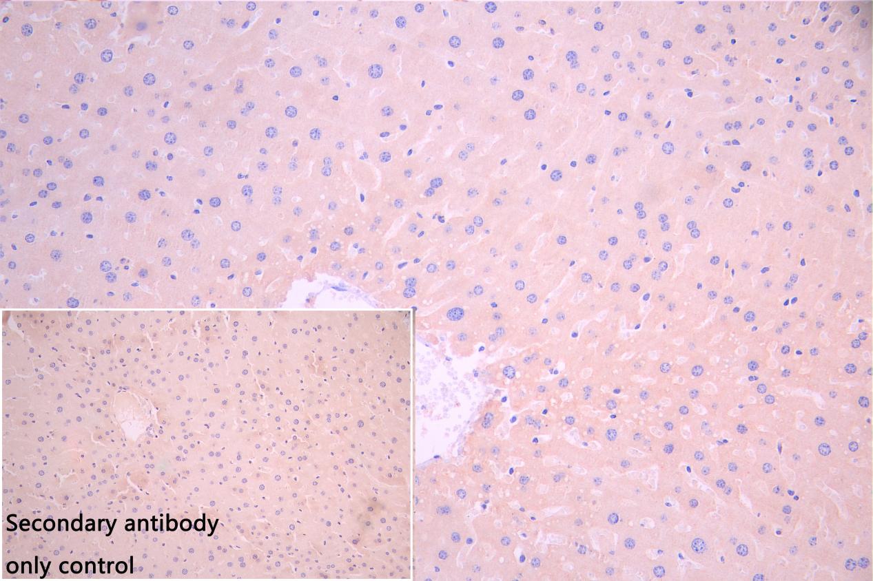 IHC image of CSB-PA897585LA01HU diluted at 1:100 and staining in paraffin-embedded mouse liver tissue performed on a Leica BondTM system. After dewaxing and hydration, antigen retrieval was mediated by high pressure in a citrate buffer (pH 6.0). Section was blocked with 10% normal goat serum 30min at RT. Then primary antibody (1% BSA) was incubated at 4°C overnight. The primary is detected by a Goat anti-rabbit polymer IgG labeled by HRP and visualized using 0.05% DAB. Secondary antibody only control: uses 1% BSA instead of primary antibody