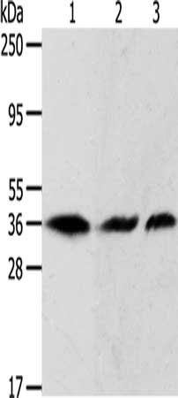 Gel: 12%SDS-PAGE, Lysate: 40 μg, Lane 1-3: Hela cells, 293T cells, A431 cells, Primary antibody: CSB-PA289847(APEX1 Antibody) at dilution 1/450, Secondary antibody: Goat anti rabbit IgG at 1/8000 dilution, Exposure time: 1 minute