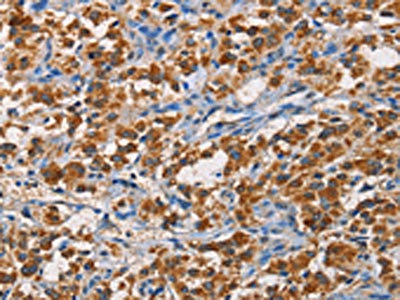 The image on the left is immunohistochemistry of paraffin-embedded Human liver cancer tissue using CSB-PA229044(APLNR Antibody) at dilution 1/50, on the right is treated with fusion protein. (Original magnification: ×200)