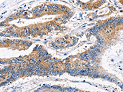 The image on the left is immunohistochemistry of paraffin-embedded Human colon cancer tissue using CSB-PA165028(APLNR Antibody) at dilution 1/40, on the right is treated with fusion protein. (Original magnification: ×200)
