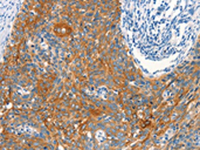 The image on the left is immunohistochemistry of paraffin-embedded Human cervical cancer tissue using CSB-PA620636(ARFGEF2 Antibody) at dilution 1/25, on the right is treated with synthetic peptide. (Original magnification: ×200)
