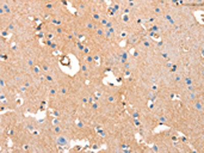 The image on the left is immunohistochemistry of paraffin-embedded Human brain tissue using CSB-PA599713(ARFGEF2 Antibody) at dilution 1/50, on the right is treated with synthetic peptide. (Original magnification: ×200)