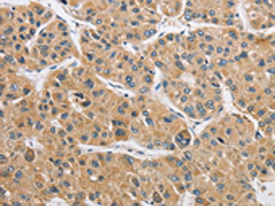 The image on the left is immunohistochemistry of paraffin-embedded Human liver cancer tissue using CSB-PA990163(ARHGAP15 Antibody) at dilution 1/50, on the right is treated with fusion protein. (Original magnification: ×200)