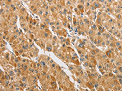 The image on the left is immunohistochemistry of paraffin-embedded Human liver cancer tissue using CSB-PA564021(ARHGAP5 Antibody) at dilution 1/30, on the right is treated with fusion protein. (Original magnification: ×200)