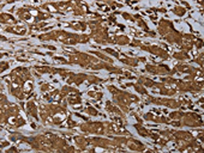 The image on the left is immunohistochemistry of paraffin-embedded Human liver cancer tissue using CSB-PA048999(ARHGDIA Antibody) at dilution 1/30, on the right is treated with fusion protein. (Original magnification: ×200)