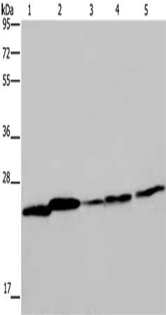 Gel: 10%SDS-PAGE, Lysate: 40 μg, Lane 1-5: Mouse spleen tissue, A375 cells, A549 cells, HT29 cells, Hela cells, Primary antibody: CSB-PA048999(ARHGDIA Antibody) at dilution 1/350, Secondary antibody: Goat anti rabbit IgG at 1/8000 dilution, Exposure time: 10 seconds