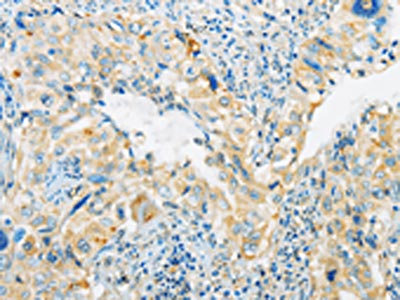 The image on the left is immunohistochemistry of paraffin-embedded Human cervical cancer tissue using CSB-PA176345(ARHGEF10 Antibody) at dilution 1/45, on the right is treated with fusion protein. (Original magnification: ×200)