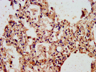 IHC image of CSB-PA002070LA01HU diluted at 1:300 and staining in paraffin-embedded human lung tissue performed on a Leica BondTM system. After dewaxing and hydration, antigen retrieval was mediated by high pressure in a citrate buffer (pH 6.0). Section was blocked with 10% normal goat serum 30min at RT. Then primary antibody (1% BSA) was incubated at 4°C overnight. The primary is detected by a biotinylated secondary antibody and visualized using an HRP conjugated SP system.