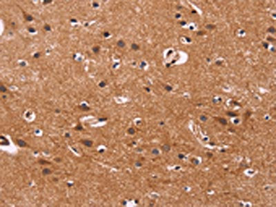 The image on the left is immunohistochemistry of paraffin-embedded Human brain tissue using CSB-PA131138(ARL4A Antibody) at dilution 1/50, on the right is treated with fusion protein. (Original magnification: ×200)