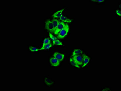 Immunofluorescence staining of PC-3 cells with CSB-PA002086LA01HU at 1:100, counter-stained with DAPI. The cells were fixed in 4% formaldehyde, permeabilized using 0.2% Triton X-100 and blocked in 10% normal Goat Serum. The cells were then incubated with the antibody overnight at 4°C. The secondary antibody was Alexa Fluor 488-congugated AffiniPure Goat Anti-Rabbit IgG(H+L).
