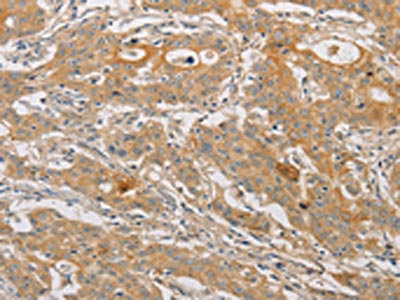 The image on the left is immunohistochemistry of paraffin-embedded Human gastic cancer tissue using CSB-PA172514(ARSK Antibody) at dilution 1/30, on the right is treated with fusion protein. (Original magnification: ×200)