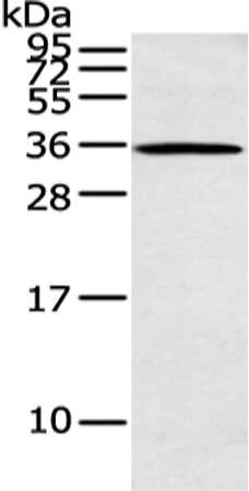 Gel: 12%SDS-PAGE, Lysate: 40 μg, Lane: K562 cell, Primary antibody: CSB-PA215341(ASB8 Antibody) at dilution 1/200 dilution, Secondary antibody: Goat anti rabbit IgG at 1/8000 dilution, Exposure time: 30 seconds