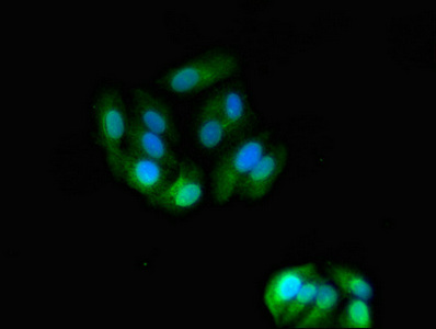 Immunofluorescent analysis of HepG2 cells using CSB-PA002208LA01HU at dilution of 1:100 and Alexa Fluor 488-congugated AffiniPure Goat Anti-Rabbit IgG(H+L)