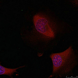 Immunofluorescence staining of methanol-fixed Hela cells using ATF2(Ab-62 or 44) Antibody.
