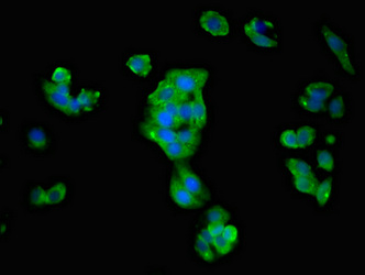 Immunofluorescent analysis of HepG2 cells using CSB-PA002326LA01HU at dilution of 1:100 and Alexa Fluor 488-congugated AffiniPure Goat Anti-Rabbit IgG(H+L)