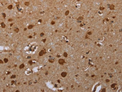 The image on the left is immunohistochemistry of paraffin-embedded Human brain tissue using CSB-PA794578(ATP2A1 Antibody) at dilution 1/30, on the right is treated with synthetic peptide. (Original magnification: ×200)