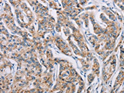 The image on the left is immunohistochemistry of paraffin-embedded Human prostate cancer tissue using CSB-PA983266(ATP2C1 Antibody) at dilution 1/50, on the right is treated with fusion protein. (Original magnification: ×200)