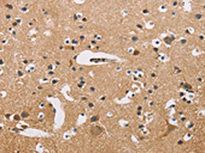 The image on the left is immunohistochemistry of paraffin-embedded Human brain tissue using CSB-PA983266(ATP2C1 Antibody) at dilution 1/50, on the right is treated with fusion protein. (Original magnification: ×200)