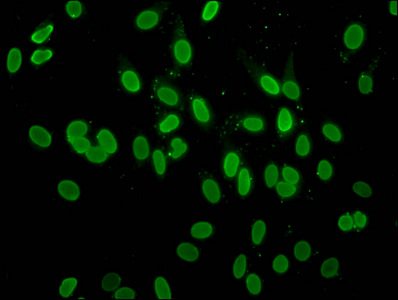 Immunofluorescence staining of Hela cells with CSB-PA010100OA04acHU at 1:10, counter-stained with DAPI. The cells were fixed in 4% formaldehyde, permeabilized using 0.2% Triton X-100 and blocked in 10% normal Goat Serum. The cells were then incubated with the antibody overnight at 4°C. The secondary antibody was Alexa Fluor 488-congugated AffiniPure Goat Anti-Rabbit IgG(H+L).