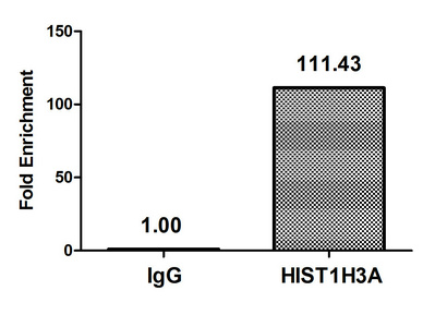 Chromatin Immunoprecipitation Hela (4*106, treated with 30mM sodium butyrate for 4h) were treated with Micrococcal Nuclease, sonicated, and immunoprecipitated with 5µg anti-HIST1H3A (CSB-PA010418OA04acHU) or a control normal rabbit IgG. The resulting ChIP DNA was quantified using real-time PCR with primers against the β-Globin promoter.