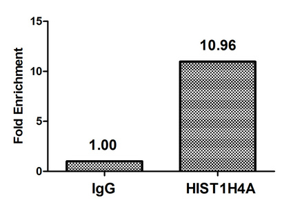 Chromatin Immunoprecipitation Hela (4*106, treated with 30mM sodium butyrate for 4h) were treated with Micrococcal Nuclease, sonicated, and immunoprecipitated with 8µg anti-HIST1H4A (CSB-PA010429PA16acHU) or a control normal rabbit IgG. The resulting ChIP DNA was quantified using real-time PCR with primers against the β-Globin promoter.