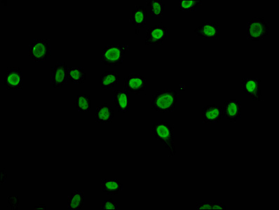 Immunofluorescence staining of Hela cells (treated with 30mM sodium butyrate for 4h) with CSB-PA010429OA79acHU at 1:5, counter-stained with DAPI. The cells were fixed in 4% formaldehyde, permeabilized using 0.2% Triton X-100 and blocked in 10% normal Goat Serum. The cells were then incubated with the antibody overnight at 4°C. The secondary antibody was Alexa Fluor 488-congugated AffiniPure Goat Anti-Rabbit IgG(H+L).