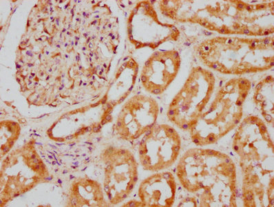 IHC image of CSB-PA847625LA01HU diluted at 1:200 and staining in paraffin-embedded human kidney tissue performed on a Leica BondTM system. After dewaxing and hydration, antigen retrieval was mediated by high pressure in a citrate buffer (pH 6.0). Section was blocked with 10% normal goat serum 30min at RT. Then primary antibody (1% BSA) was incubated at 4°C overnight. The primary is detected by a biotinylated secondary antibody and visualized using an HRP conjugated SP system.