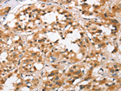 The image on the left is immunohistochemistry of paraffin-embedded Human thyroid cancer tissue using CSB-PA697671(BCAS4 Antibody) at dilution 1/50, on the right is treated with synthetic peptide. (Original magnification: ×200)