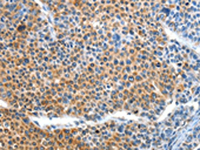 The image on the left is immunohistochemistry of paraffin-embedded Human liver cancer tissue using CSB-PA596925(BCL2L2 Antibody) at dilution 1/15, on the right is treated with fusion protein. (Original magnification: ×200)