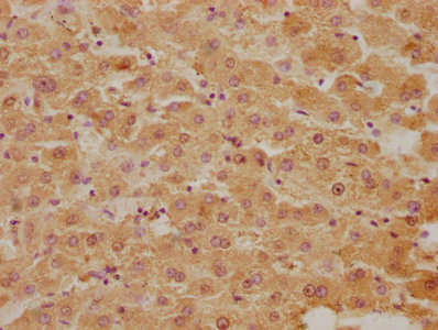 IHC image of CSB-PA002722HA01HU diluted at 1:300 and staining in paraffin-embedded human liver tissue performed on a Leica BondTM system. After dewaxing and hydration, antigen retrieval was mediated by high pressure in a citrate buffer (pH 6.0). Section was blocked with 10% normal goat serum 30min at RT. Then primary antibody (1% BSA) was incubated at 4°C overnight. The primary is detected by a biotinylated secondary antibody and visualized using an HRP conjugated SP system.