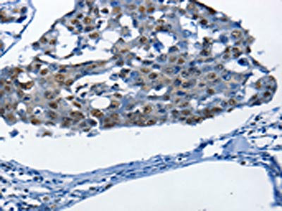 The image on the left is immunohistochemistry of paraffin-embedded Human breast cancer tissue using CSB-PA949748(BPIFB1 Antibody) at dilution 1/25, on the right is treated with synthetic peptide. (Original magnification: ×200)