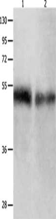 Gel: 10%SDS-PAGE, Lysate: 50 μg, Lane 1-2: Human tongue tissue, Human laryngocarcinoma tissue, Primary antibody: CSB-PA949748(BPIFB1 Antibody) at dilution 1/500, Secondary antibody: Goat anti rabbit IgG at 1/8000 dilution, Exposure time: 1 minute