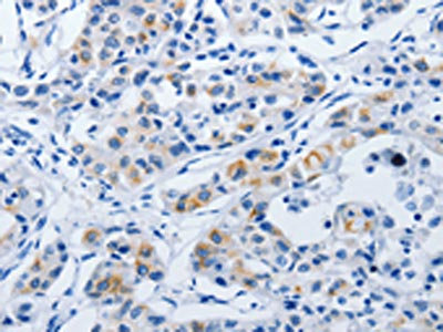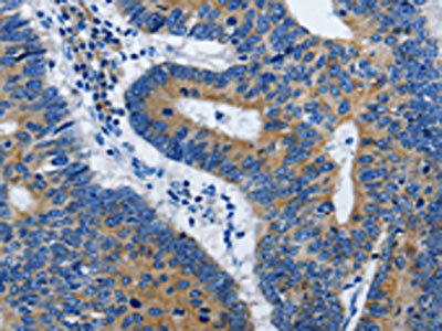 The image on the left is immunohistochemistry of paraffin-embedded Human colon cancer tissue using CSB-PA578519(BPIFB3 Antibody) at dilution 1/50, on the right is treated with synthetic peptide. (Original magnification: ×200)