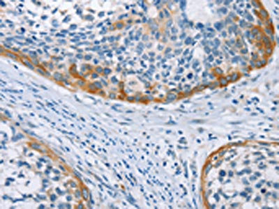 The image on the left is immunohistochemistry of paraffin-embedded Human cervical cancer tissue using CSB-PA210441(C3AR1 Antibody) at dilution 1/25, on the right is treated with fusion protein. (Original magnification: ×200)