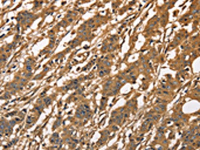 The image on the left is immunohistochemistry of paraffin-embedded Human gastic cancer tissue using CSB-PA014561(CAPZA3 Antibody) at dilution 1/40, on the right is treated with fusion protein. (Original magnification: ×200)