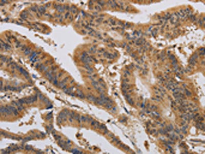 The image on the left is immunohistochemistry of paraffin-embedded Human colon cancer tissue using CSB-PA907913(CASP10 Antibody) at dilution 1/20, on the right is treated with synthetic peptide. (Original magnification: ×200)