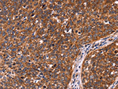 The image on the left is immunohistochemistry of paraffin-embedded Human colon cancer tissue using CSB-PA520696(CCDC106 Antibody) at dilution 1/60, on the right is treated with fusion protein. (Original magnification: ×200)