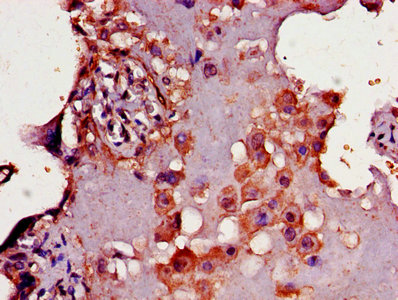 IHC image of CSB-PA004925LA01HU diluted at 1:300 and staining in paraffin-embedded human placenta tissue performed on a Leica BondTM system. After dewaxing and hydration, antigen retrieval was mediated by high pressure in a citrate buffer (pH 6.0). Section was blocked with 10% normal goat serum 30min at RT. Then primary antibody (1% BSA) was incubated at 4°C overnight. The primary is detected by a biotinylated secondary antibody and visualized using an HRP conjugated SP system.