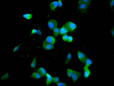 Immunofluorescence staining of SH-SY5Y cells with CSB-PA810285LA01HU at 1:100, counter-stained with DAPI. The cells were fixed in 4% formaldehyde, permeabilized using 0.2% Triton X-100 and blocked in 10% normal Goat Serum. The cells were then incubated with the antibody overnight at 4°C. The secondary antibody was Alexa Fluor 488-congugated AffiniPure Goat Anti-Rabbit IgG(H+L).