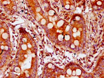 IHC image of CSB-PA810285LA01HU diluted at 1:300 and staining in paraffin-embedded human small intestine tissue performed on a Leica BondTM system. After dewaxing and hydration, antigen retrieval was mediated by high pressure in a citrate buffer (pH 6.0). Section was blocked with 10% normal goat serum 30min at RT. Then primary antibody (1% BSA) was incubated at 4°C overnight. The primary is detected by a biotinylated secondary antibody and visualized using an HRP conjugated SP system.