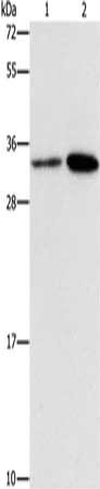 Gel: 15%SDS-PAGE, Lysate: 40 μg, Lane 1-2: Hela cells, A431 cells, Primary antibody: CSB-PA037967(CDC34 Antibody) at dilution 1/900, Secondary antibody: Goat anti rabbit IgG at 1/8000 dilution, Exposure time: 1 minute