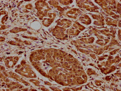 IHC image of CSB-PA28369A0Rb diluted at 1:600 and staining in paraffin-embedded human pancreatic cancer performed on a Leica BondTM system. After dewaxing and hydration, antigen retrieval was mediated by high pressure in a citrate buffer (pH 6.0). Section was blocked with 10% normal goat serum 30min at RT. Then primary antibody (1% BSA) was incubated at 4°C overnight. The primary is detected by a biotinylated secondary antibody and visualized using an HRP conjugated SP system.