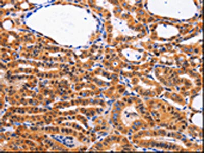 The image on the left is immunohistochemistry of paraffin-embedded Human thyroid cancer tissue using CSB-PA597701(CDK4 Antibody) at dilution 1/10, on the right is treated with fusion protein. (Original magnification: ×200)