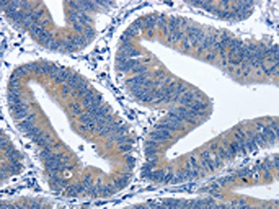 The image on the left is immunohistochemistry of paraffin-embedded Human colon cancer tissue using CSB-PA986354(CDK5RAP3 Antibody) at dilution 1/40, on the right is treated with fusion protein. (Original magnification: ×200)