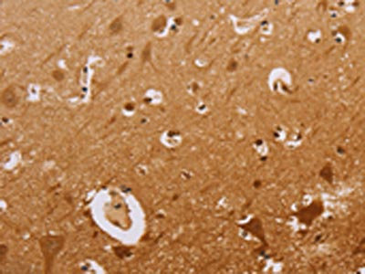 The image on the left is immunohistochemistry of paraffin-embedded Human brain tissue using CSB-PA194515(CEL Antibody) at dilution 1/50, on the right is treated with synthetic peptide. (Original magnification: ×200)